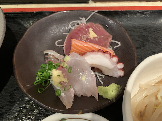 脂の乗ったとろさば本マグロの叩きの合わせ技、ご飯おかわりしてしまいました、お味噌汁も関西仕立てで 好きな味です 御膳につく 黒豆茶を 食後にいただいて昼まったり気分を 味わえます
