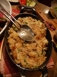 2015/9/25 金曜日 待望のグリルドエイジング・ビーフ 飯田橋店にて熟成和牛をたっぷりいただきましたこの日は、高校の東京同窓会メンバーで開催している美食倶楽部の第五回定例会です一昨年からテーマは肉、肉、魚、魚ときて今回第五回目は肉でいくことになりました熟成肉をいただけるグリルド エイジング・ビーフは予約がちょっと取りにくいお店2ヶ月前から予約して金曜日の18:30からの席を予約しておきました大テーブル12人とボックス席4人の合計16名分です今回は12名の参加者にサプライズ企画で就活終わった後輩と関西から出張中の1名の4名が加わっての合計16名で、予約人数満席での開始となりました生憎の雨の日、会社を定時に退社して、そそくさと出てお店へ向かいましたお店は4名+4名+4名のテーブル3つをつなげて12名の大グループ席にあとは4人掛けのボックス席を1つで全部で16席の配置このお店は、元々4人テーブルが中心の配置で全部で47席のお店そのうち16席を借りての宴会となりましたすでに遅れると連絡はいった人以外は全員集まっております本日のコースは、お一人様5,000円で、圧巻の大判肉をいただけるグリルド・エイジングコースプラン内容は●熟成和牛のシャルキュトリー盛り合わせ●グリーンサラダ ~トリュフドレッシング&焼きレモン~●本日のオーブン焼き●本日のスープ●浅漬け風ピクルス●本日の熟成和牛大判一枚肉●本日のガロニチュール●熟成和牛の鉄板ガーリックライス●本日のデザート全9品ですそれに飲み放題プラン1,800円をプラスしております最初の乾杯は、シャンパン・サービスで開始よし、肉をいただきましょう最初に出てきたのは、熟成和牛のシャルキュトリー盛り合わせベーコンなど3種のお肉を味わいましたレバーパテも付いておりますガーリックトーストと一緒にいただきましょうレバーパテをガーリックトーストにのせて最初はお肉何もつけないでそのままあとは、お好みで塩、やブルーベリーソースをかけていただきました上品な熟成肉おいしいです~お酒も進みそうさっそく2杯目はビールを注文ですグリーンサラダでてきました~トリュフドレッシング&焼きレモン~ということですので、焼きレモンを搾ってトリュフドレッシングのかかった野菜の上にかけていただきました先ほどのお肉と添えていただくと美味ですね本日のオーブン焼きがでてきました具材がなにかをお店の方から聞き忘れておりますがポテトとチーズを楽しめるオーブン料理でございましたこのあたりでテーブルを立ったり座ったりしておりますのでお店の方の説明はほぼ聞いていないのは間違いございませんがとにかく美味しいのは確かですつづいて本日のスープたしか記憶が正しければ、南瓜ポタージュだったかな美味しくいただきました浅漬け風ピクルスですパプリカ、ズッキーニ(きゅうり)、人参、カブなんぞのピクルスですピクルスのビネガーの味でお肉の口直しとしてさっぱりいたしましたいよいよ大詰め熟成和牛大判一枚肉やってまいりました部位をお店の方はきっと、部位の説明したことでしょう想像するにランプかな~切り分けていただきましたここで3杯目のドリンクはハイボールを注入脂肪分があまりない柔らかい赤身でした熟成肉とハイボールの組み合わせもグッドでしたガロニチュールはクリームスピニッチです熟成肉の添えはほうれん草が良く合いますバターの風味たっぷりの食べたことのない味いい塩梅です熟成和牛の鉄板ガーリックライスガーリックライスの上に乗せられて鉄板と共に運ばれてきましたテーブルの上で混ぜ合わせてもらっていただきましょうガーリックがよく効いておりました翌日までしっかりガーリック残ってましたでもガーリックライス癖になるおいしさです最後はデザートアイスクリームミントの葉が添えられていますヒンヤリしたもので締めくくり同窓会メンバーとの楽しい時間と熟成肉をしっかり堪能できた夜でしたお店を出てから、雨が降っているにも関わらずお店の前で記念撮影を行って次回の美食倶楽部での再会を誓っておきましたごちそうさまでした