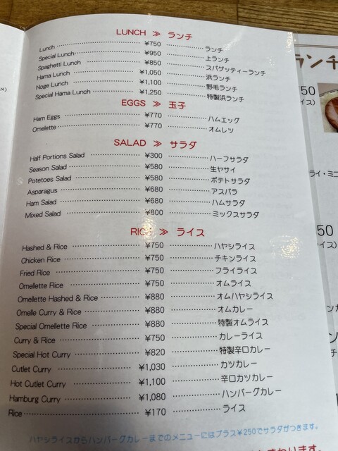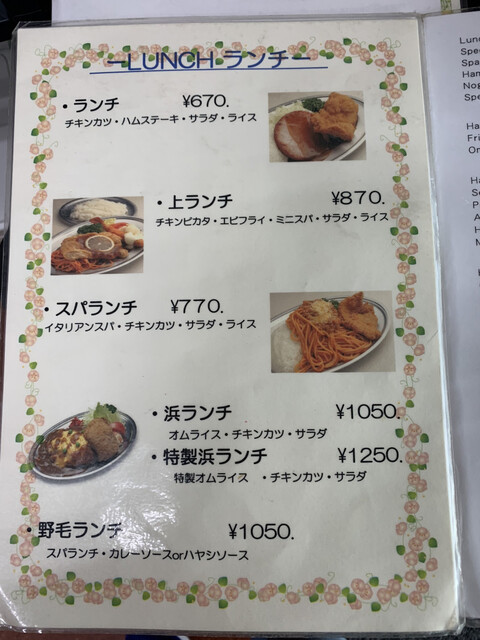ランチメニューには、ランチ、上ランチ、浜ランチ、野毛ランチなど