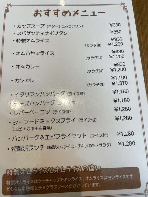 メニューの説明も有名なオムライスは、写真が載っていない左側のオムライスです。特製がつくのとつかないものの違いはケチャップライスか白ごはんの違いだそう。初めて訪れた人には優しい心配りですね。