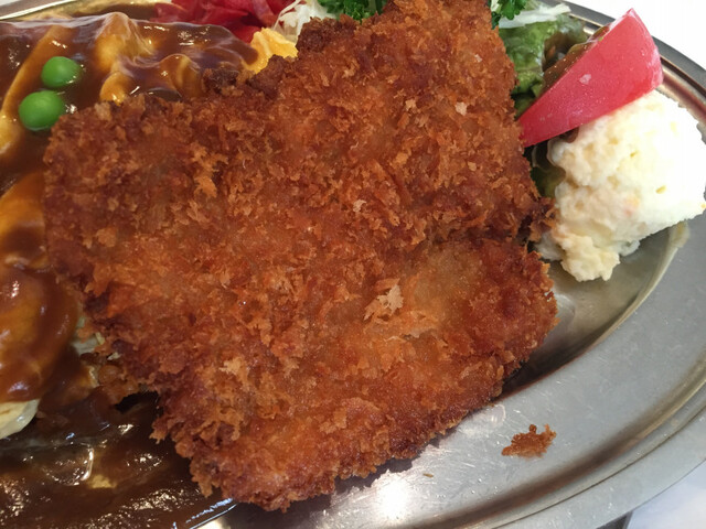 大きなチキンカツが存在感を放つワンプレート。サクッと揚がった衣に、やわらかジューシーな鶏肉、濃厚なデミグラスソースがたっぷりかかっていて、ひと口ごとに満足感が広がります。オムライスのご飯は懐かしさを誘うケチャップライス。昔ながらの味わいが心をほぐしてくれます。