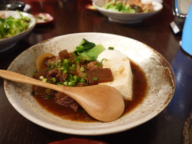 ■2012/2/14 店長さんが今月から変わりました 新しい店長さんになってから初めて行きました。今日は 牛すじ豆腐味噌煮込み定食です。最初に 切り干し大根の煮物と漬け物小皿 、続いて 牛すじとこんにゃくと豆腐の味噌煮込みが出てきました、青梗菜が彩りで入っていていいですね。味噌煮込み牛すじと豆腐の相性はばっちしです。今日も美味しくいただきました ごちそう様です