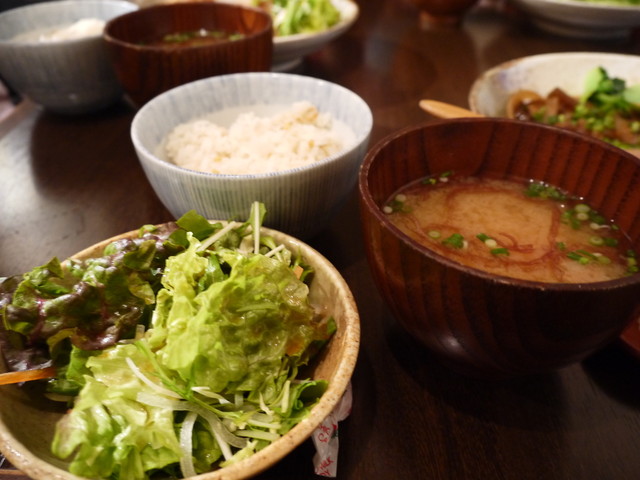 定食には 小鉢とお味噌汁と 雑穀米 それに おいしいお茶(トウモロコシのお茶とか)と一緒にいただけます。