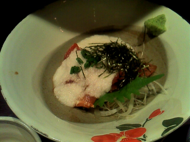 カウンターでいただくのは、もしかしてはじめてかも知れません。カウンターには夜に来たくなるお酒が鎮座しております。今日はマグロの山かけ定食です。中トロのまぐろにたっぷりのとろろいも、海苔もちらして、雑穀米に乗せていただきました。つるつるの食感はなかなか楽しめました。お味噌汁も少しお味が変わったかもしれません。食材にやっぱり凝っています、あらためて人気の秘密がひとつわかった気になりました ごちそう様でした う~ん満腹
