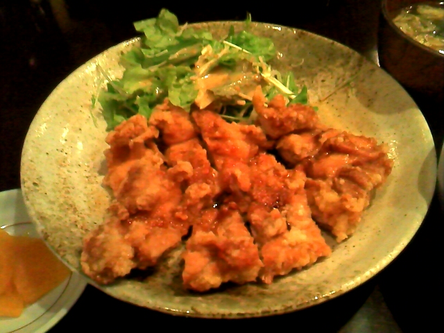■2012/11/26 なんと長いこと来ておりませんでした、今日は雨も降って寒いので、暖まるランチということで、ごち屋さんに来ました。二階席があいておりましたので、二階席に案内いただきました。二階席は板の間に3人掛けのテーブルが3卓です。料理の方は定番の鶏の唐揚げおろしポン酢です。ちょっとボリュームのある鶏の唐揚げにおろしポン酢でいただくとさっぱりしていて美味しかったです。今日も鶏から満足です 満腹です