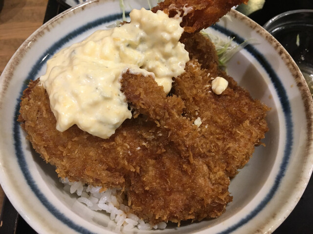 2020/12/18 早出勤務のランチタイム、久しぶりに新潟カツ丼 タレカツに行ってみることに。お店に着いた時はすでに満席、数組が待っていました。人気店です。カウンタースタイルのお店 ランチタイムはセットメニューがありますので少しお得。久しぶりのあいもり丼を頼みました。エビフライがつくので、タルタルソースがいるか聞かれます。もちろんつけてもらうことにしましょう。それと温玉追加で。ちょうど1000円になりますね。温玉プラスを楽しんでみましょう。いりこ出汁の効いたお味噌汁とキャベツのサラダと白菜と生姜のお漬物が付いてます。それにタルタルソースの小鉢と温玉の小鉢。千切りキャベツが少し添えられて、あまじょっぱいたれにくぐらせてあるかつ二枚とエビフライです。ご飯にも少したれかけてあります。いただきます。タルタルソースをエビフライだけでなくタレカツにも乗せてお口の中へ。少し甘めのタルタルソースのまろやなか風味とあまじょっぱい味が柔らかいかつを盛り立てくれます。何回食べても美味しい、ご飯も進みますね。次はエビフライです。サクッと上がったエビフライもいい感じで美味しい。半分ほど食べてから、温玉登場です。温玉を丼の上にかけていただきます。温玉の黄身がかつの衣に絡まって、味変です。さらにまろやかなお味に堪能しました。今回も美味しくいただきました。ごちそうさまでした。