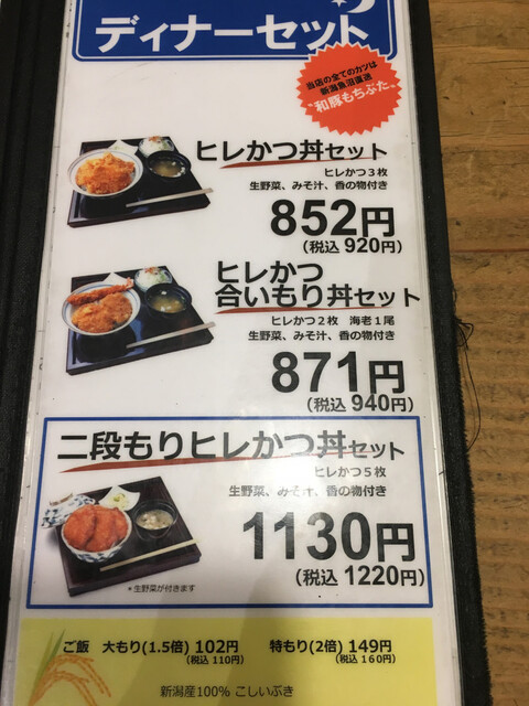 新潟タレカツ丼が食べたい気分でしたので、ちょっと遠いですがやって来ました、お店の表にはランチタイムでちょっとおとくなメニュー、カツ丼セットと合盛り丼セットがでています、今日は合盛り丼をいただきました、タレカツが二枚と海老フライ1尾です、タルタルソースを付けてもらいました、タレカツいただきつつ海老フライをちょっとこのバランスがよいですね、お味噌汁とキャベツのお漬け物とサラダがついているのでちょうどよいボリュームです、タウン誌が置いてありました、このタウン誌にお店が紹介されておりました、今日も美味しかったですごちそうさまでした