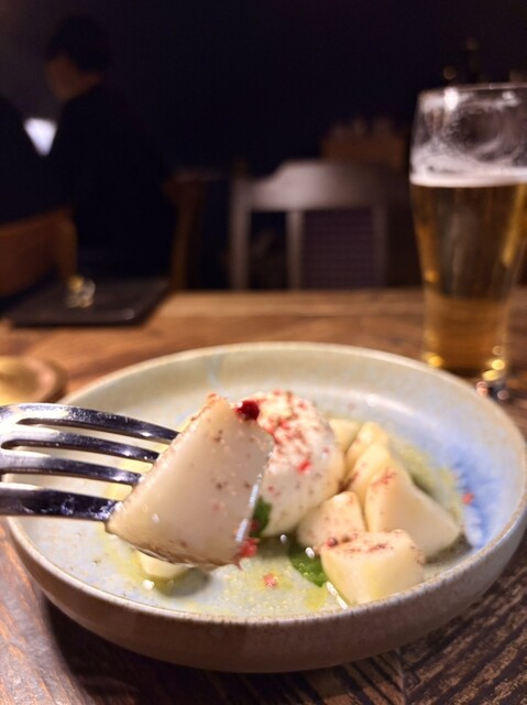 温菜は、山形リーキのグラタンと牡蠣フライ。リーキ特有の臭みないやさしい甘みがしっかり活かされ、牡蠣の旨味と合わさることで、より奥行きのある味わいに。重くなりすぎない仕上がりも好印象です。✨