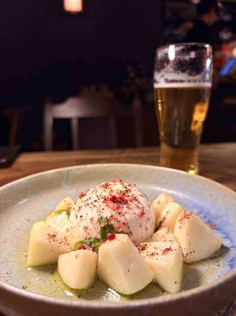 前菜は、山形ラ・フランスとブラータチーズのカプレーゼ。ミントリーフ、ピンクペッパー、シナモンパウダーのアクセントが秀逸で、甘さ・香り・スパイス感のバランスが非常に良い一皿。ブラータの滑らかさとラ・フランスの瑞々しさが見事に調和し、完成度の高さを感じます。^_^✨