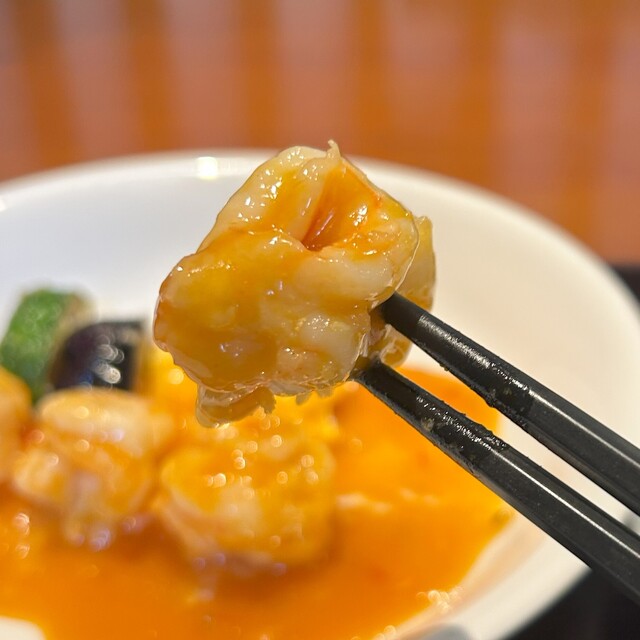 ・選べるメインはエビチリ・酢豚・唐揚げの中よりエビチリをチョイス! チリソースは甘めで辛くないのでエビの美味しさとプリプリ食感をしっかり味わえます。