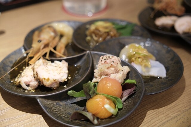 牡丹海老、帆立の紹興酒漬け、フルーツトマトのカプレーゼ、チャイニーズポテトサラダ、よだれ鶏の豪華盛り合わせ。