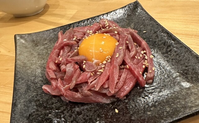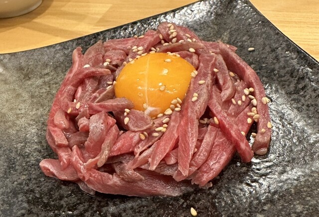 焼肉屋さんの食材を使用したコラボメニューの中で、メンチカツ、ユッケ、もつ刺し、スタミナホルモン炒めを注文。メンチカツはこれでもかというボリュームで肉汁のジューシーさが抜群で大衆酒場の域を超えています。ユッケ、もつ刺しもホルモン炒めも鮮度が良いお肉屋さんのホルモンを感じれて、鰻以外での楽しみも見つけられるメニューです。
