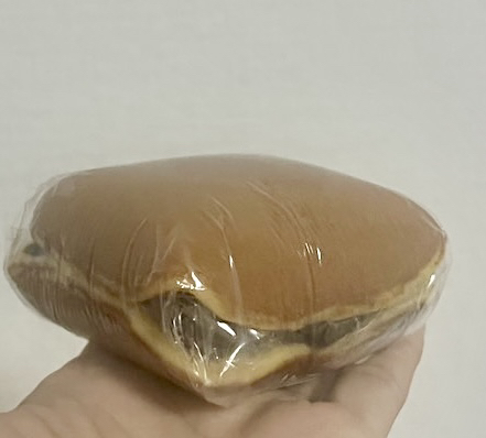 バタどら。手にコロンと収まる可愛いサイズですが、厚みがあり、超高カロリーです。382kcal!!!!