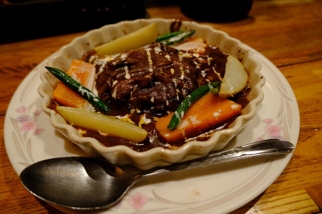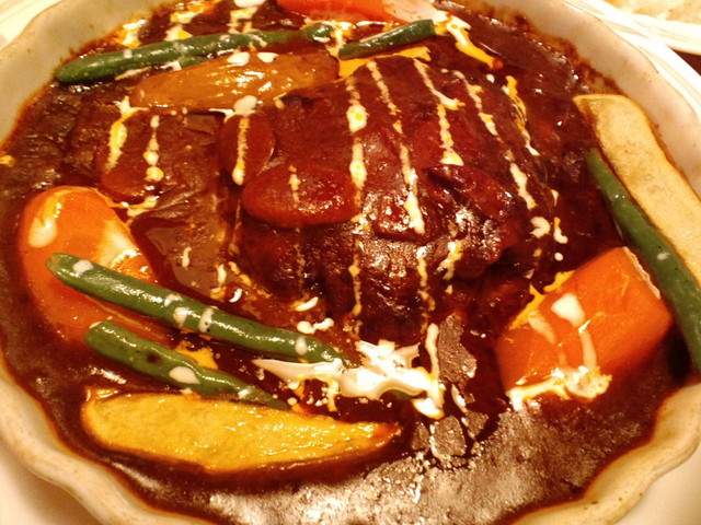 これはこれは、何年か越しの初対面だけあって、そそるビジュアルをしてくれている。濃いブラウンの源泉が張られた狭い金魚鉢の表層を、にんじん、いんげん、ポテトが色とりどり、潜行するはマッシュルーム、形をわずかに残す玉葱、それらが窮屈そうにハンバーグの周りを泳いでいる。