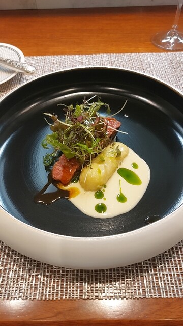 百合根のニョッキはモチモチしていて、普通のニョッキと違った食感がして美味しかったが、肝心のお肉は中がレアで冷えていたため、自分が期待しているステーキとは少し違った。意図的なものなんでしょうか?