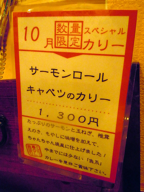 注文は、ぎりぎりまでかなり迷ったのですが、結局スープは海老スープ、メインは今月のスペシャル限定カリー(サーモンロール キャベツのカリー)、無料トッピングは舞茸が品切れとのことでオニオンチップス、トッピングは厚切りベーコン、辛さは一番辛くない睦月、ライスは大盛(450g)でお願いしました。