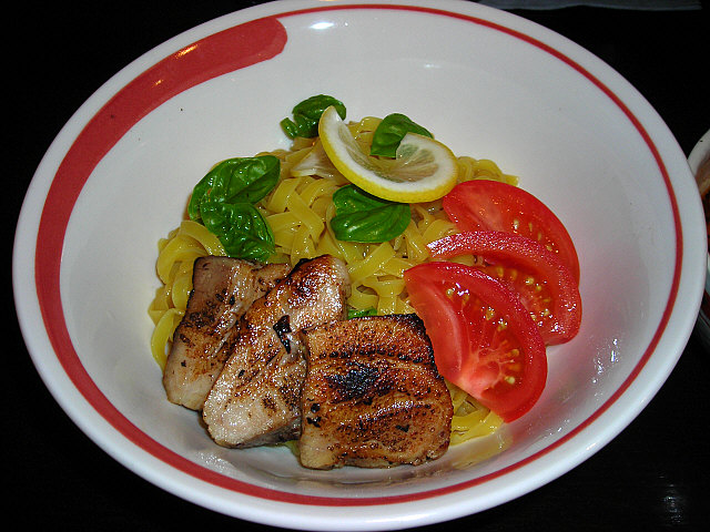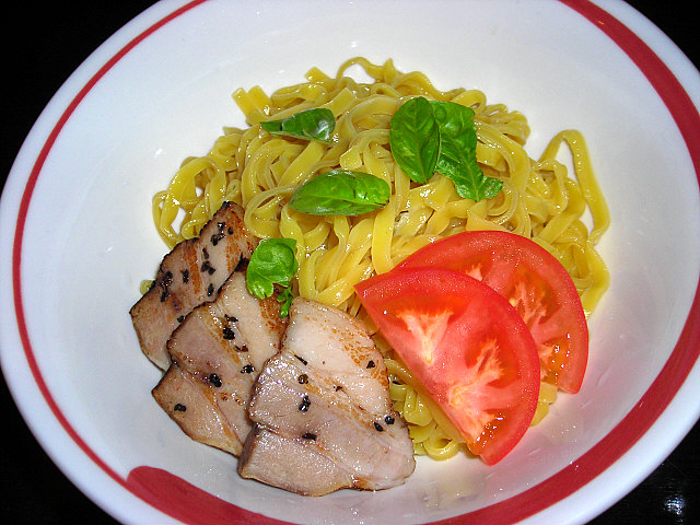 ゆでたての麺が少し熱ったですが、トマトソースと混ぜて・・・うん、美味しいですね!