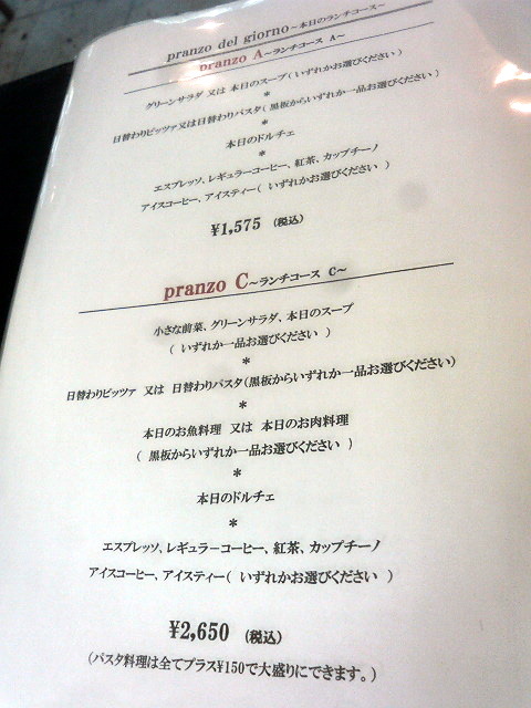 家内共々ランチコースCを注文し、ピッツァとパスタをひとつずつ注文し取り分けさせてもらうことにし、メインはお互い好きなものを選びました。