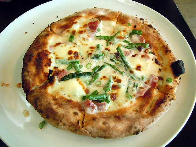 ピッツァは、アスパラ、ロースハム、生クリーム、モッツァレラチーズのピッツァです。