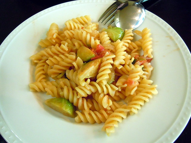 パスタは、芽キャベツ、アンチョビ、玉ネギ、トマト入りのフジッリです。