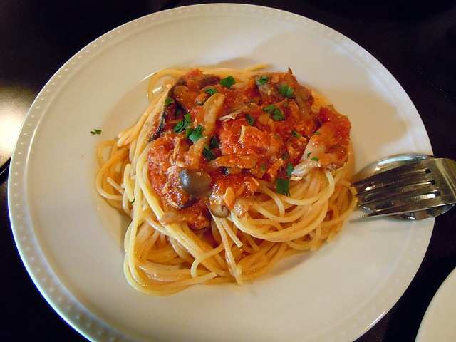 キノコ、ツナ入りトマトソースのスパゲッティ