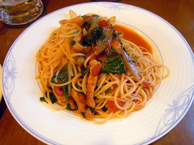 豚肉とホウレン草のトマトソーススパゲッティーニ