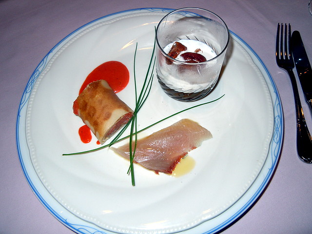 前菜は、白子のクレープサーモンマリネのロトロ、海老のエキスのゼリー生ウニのアクセント、カンパチのカルパッチョ塩の花)の3種類です。