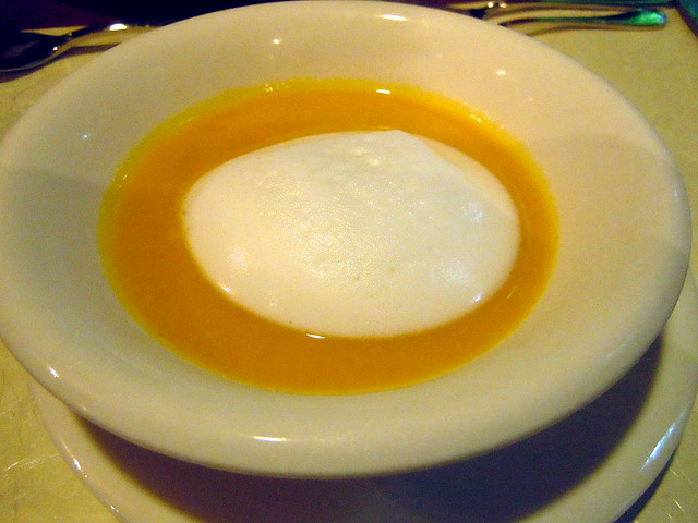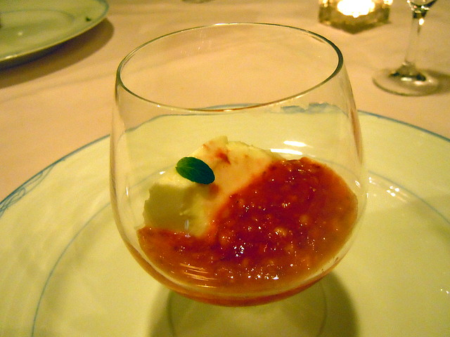 ひとつめは、パンナコッタにフレッシュな苺のソースがかかっていて、さっぱりした感じでした。