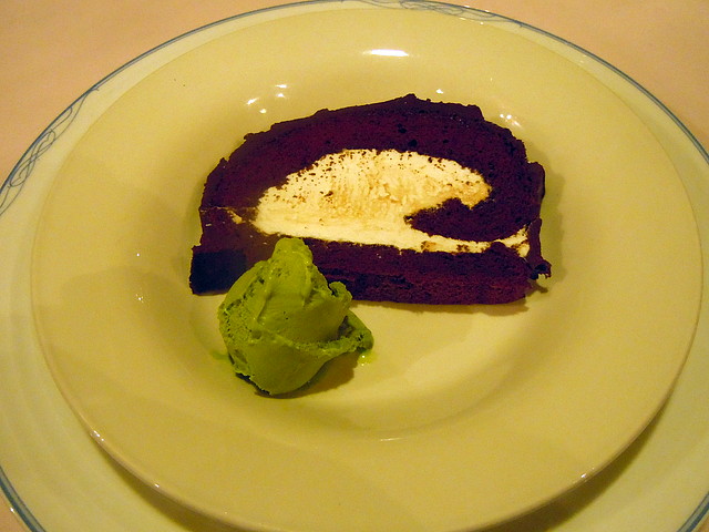 大きめにカットされたチョコレートのロールケーキに抹茶の色をしたピスタチオのアイスの組み合わせです。