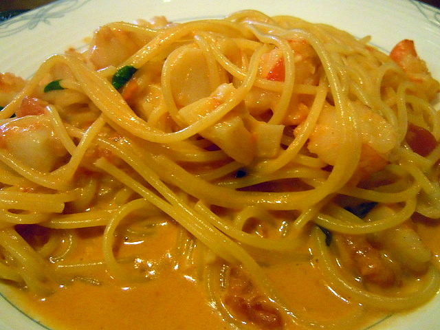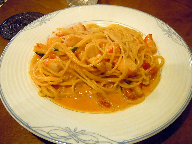 海老とホタテがたっぷり入っていて、トマトクリームのソースがとっても美味しかったです。
