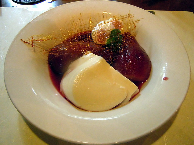 この日のドルチェは洋梨のコンポートでした。これまたとってもボリュームがあり、全員お腹いっぱいの中、何とか食べきりました。