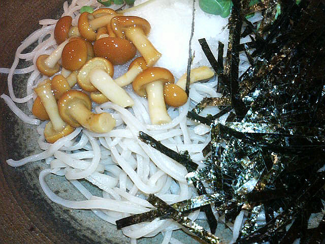 ぶっかけそばは、大きなお皿の上に盛られたそばの上に、なめこ、大根おろし、カイワレ大根、刻みのりが載っていて、別皿で、天かす、刻みネギ、わさびが付いていました。