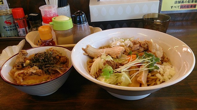味付けバラスライスと卵黄入り、中太麺使用、コッテリ甘めのスープですと券売機に書かれていました。