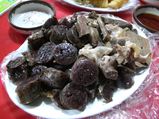 見た目はスペインのモルシージャみたいな感じで、豚の腸に豚の血と春雨、餅米、香菜を入れたもの。