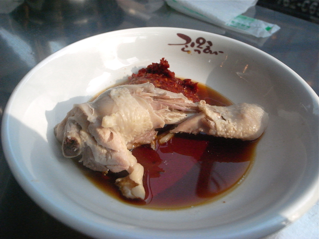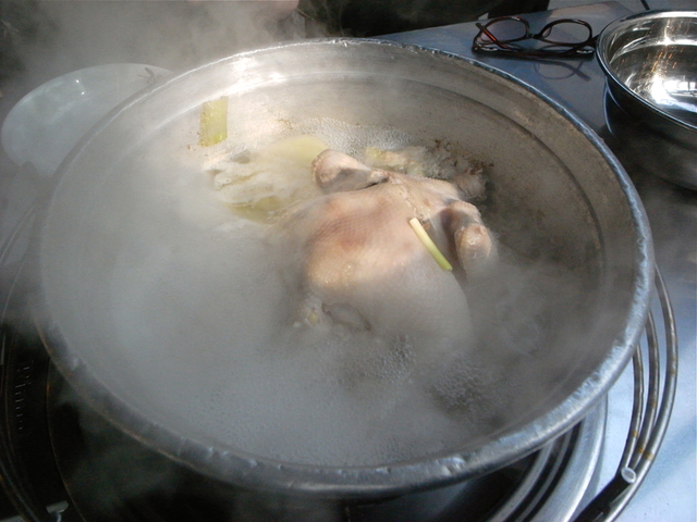 韓国の水炊き(タッカンマリ)には見事な鶏が一匹丸ごと入っています。