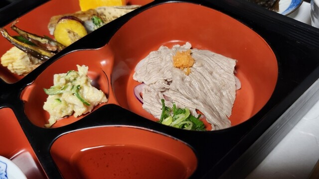 近江牛のお店に行く予定でしたがその前に麩の吉井さんへ車を方向転回したので仕方がなく運河沿いの道へ、曲がった所に和食のお店が、初めてのお店なので半信半疑で入店。案内されたお部屋はお庭を眺めることのできる座敷、基本の弁当に一品つけた2700円のでお願いしました。私はお弁当に鯉の煮付け、相方はローストビーフを、先ずは白和えが出てきました。5種類くらいの素材の白和え、美味しいです。そして、鯉の煮付けがこれが大きい、直径10センチ位、厚み5センチ位。卵を持った煮付けほんのり山椒の香りのそれは美味しい煮付け!相方のローストビーフも美味しく、お弁当出てきました。滋賀県の幸が、近江牛の冷しゃぶ、小鮎、赤蒟蒻、丁字麩のからし和え、丁稚羊羮など、どれも美味しく、ご飯に付いてきた漬け物もそれは美味しく、案内して下さったお店の方、落ち着きの有る和室、そして一番嬉しかったのは、煙草を吸いたいと話していた隣の机の方にやんわりお断りされ、煙草の煙は食事の味がわからなくなりますからね。そして久しぶりに満点付けました。満足して店をあとにしました。