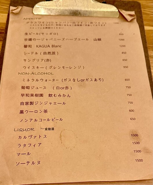 グラスワインは850円〜で料理に比べ割高感あるが、相当にこだわりあるようだ。妻とボルドーとカリフォルニアを飲み比べたが、質量ともに値段に見合っていた。
