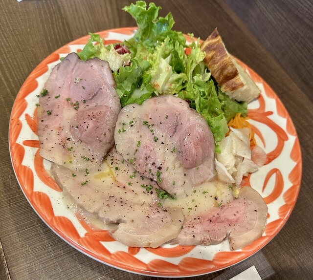 ホエー豚のポッシェは、しゃぶしゃぶのような料理。肉の旨みや柔らかい食感をあっさりしたソースで楽しめる。サラダも肉もたっぷりで1,200円は十分リーズナブル。