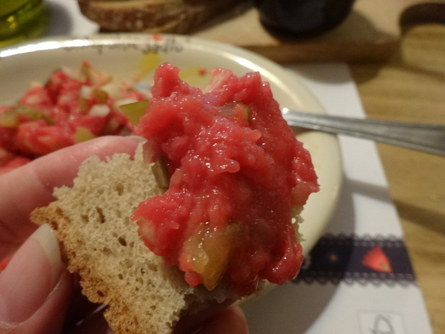 ステーキと言っても焼いてなくて生の牛肉。ユッケのように真ん中に黄身を落として、ピクルスと玉ねぎのみじん切りを混ぜてパンに乗せて食べます(^o^)
