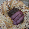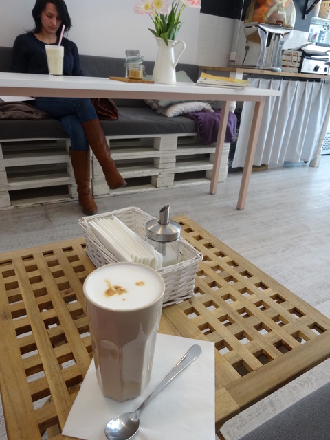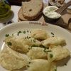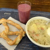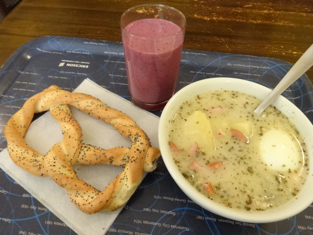 ポーランド3日目、朝ご飯は近くのバルでプレッツェルとポーランドの具だくさんスープ「ジューレック」、ブルーベリーのラッシーみたいなの。