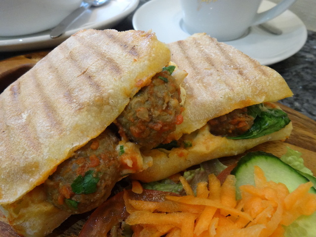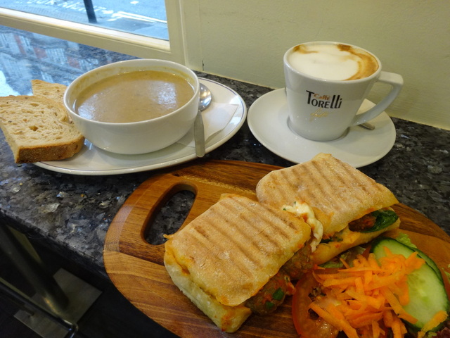 朝ごはんはホステル近くのイタリアンカフェでミートボール+バッファローモッツァレラ+ペコリーノチーズ+ベビースピナッチのパニーニとマッシュルームスープ、ラテ。