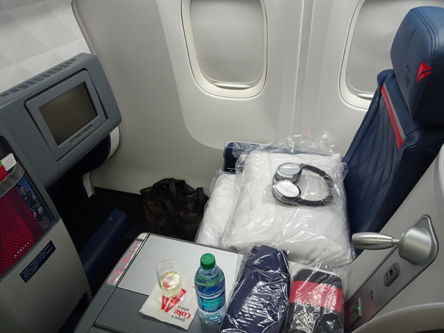 帰りはビジネスクラス。デルタのビジネスは良いって聞いてたので楽しみにしてたけど、あれれ?期待してたほどラウンジも機内の食事も豪華じゃない~。