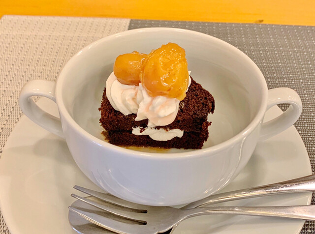 自家製のガトーショコラに添えられたサクランボは、北海道のワイナリーデクラからの佐藤錦のコンポートです。