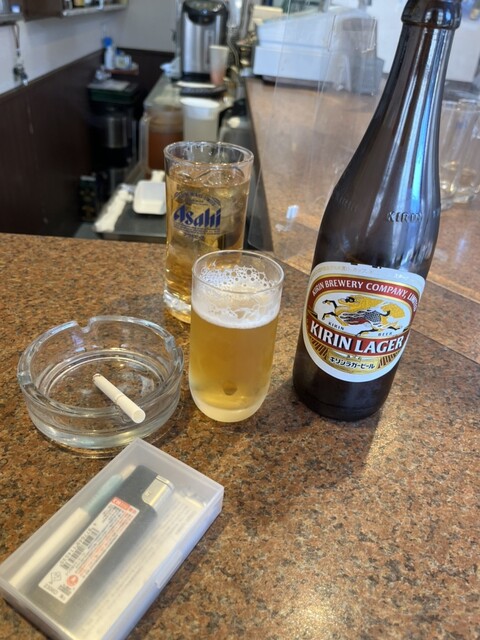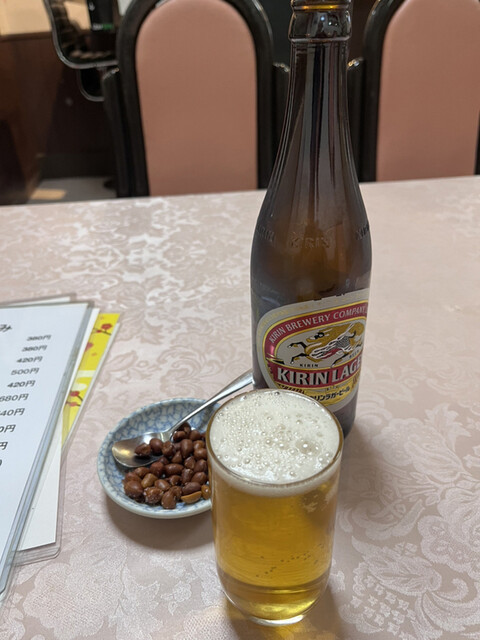 キリンビール中瓶、突き出しのピーナッツ、布おしぼり