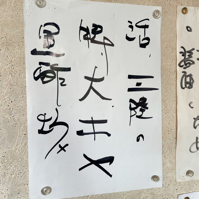 なぜかここのお店はメニュー表があるにも関わらずメニュー表を見て注文するということはあまりなく、メニュー表にあるものを注文することもあまりないんですよね~。実際お店では、「トリ!」とか「もやし!」とか謎の言葉がとびかってますw 謎の言葉は定食のことを指しているのですが、なかなか独特な感じです。普通の料理が1,500円、特別定食2,500円となっています。特別定食はいつもあるものもありますが、その日の入荷によって変わる限定メニューは手書きで壁に張り出されています。