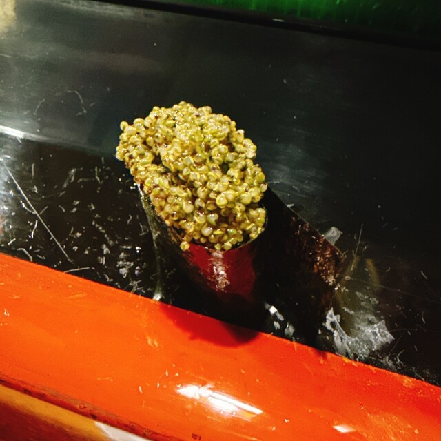 シャリは小さめで、今どきのモダンなサイズ感。最近は“引き算”の寿司が主流に感じていましたが、こちらではイカにウニをのせたもの、鮭にいくらを合わせたものなど、“足し算”で完成度を高めた寿司が印象的。中でも、ワラビのたたきを使った軍艦には驚かされました。山菜の繊細な香りが海苔と絶妙に調和していて、まさにこの店でしか味わえない一貫です。