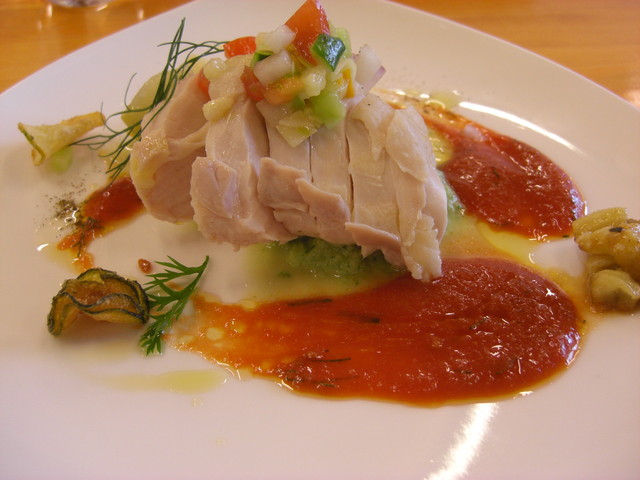 前菜は「くぼさんの豆腐」のジュレがけ、メインは鶏胸肉の蒸し鶏をキューリのソースでいただくものだった。