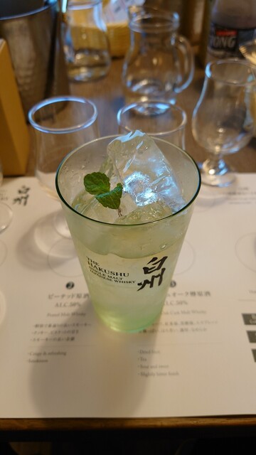 「白州蒸溜所ものづくりツアー:参加費用3000円」に行ってまいりました。小淵沢駅よりシャトルバスで15分ほど。ウイスキーの製造工程の見学を経てお楽しみのテイスティングタイム!白州の主要構成原酒(ライトリーピーテッド原酒・ピーテッド原酒・スパニッシュオーク原酒)をそれぞれテイスティング。白州ってそれほどピートを感じなかったけど二種類のピーテッド原酒使ってるんですね〜驚き。ストレート、トワイスアップでテイスティングした後、美味しいハイボールの作り方を習います。おつまみは蒸溜所内のギフトショップでも購入できる燻製ナッツやチョコなどでした。とてもためになる貴重な経験でした。最後に有料ツアー客限定で「白州12年」一本が購入できる特典がありました。「白州NV」や「蒸留所限定」も購入可能でしたが、一本のみということで迷わず「白州12年」を購入しました。ただしいつも購入できるとは限らないそうです。今回は運が良かった!