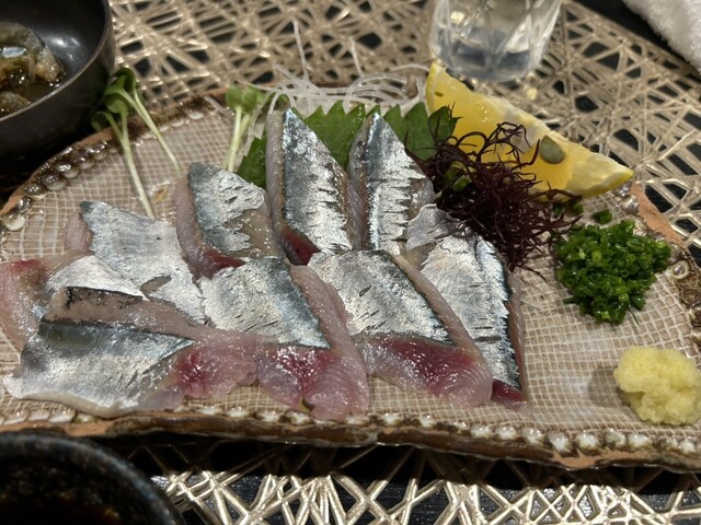 今日のお刺身は「クエの炙り、しめ鯖の炙り、あじ刺し」です。うん、美味い。