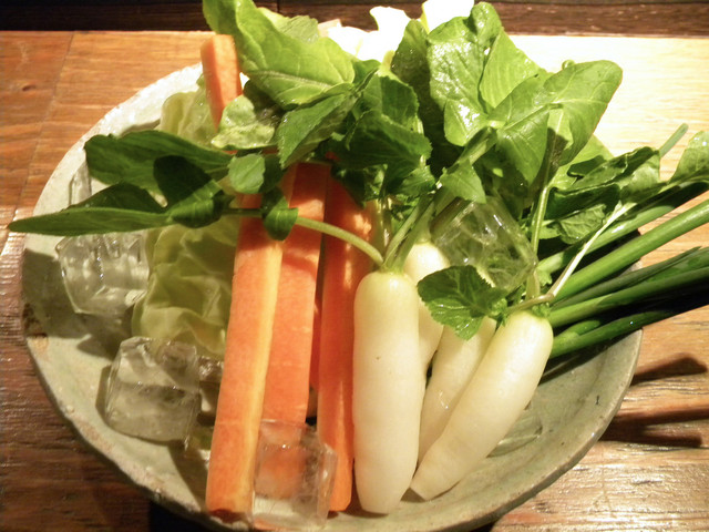 最初に、先付けとして野菜スティックとキャベツが出てきました。ネギのスティックが辛味と香りが良くてすごく美味しかった。こんな美味しいネギは始めてかも。にんじんとキャベツはみずみずしくて料理の合間に最適!